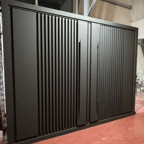 درب حیاط آهنی مدل کیت کت قابلیت سفارشیسازی بالایی دارد: میتوان ابعاد آن را بر اساس نیاز — ماشین رو (دولنگه) یا نفررو (تک لنگه) — تعیین کرد.